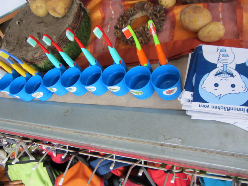 Regelmäßig kommen Frau Wessel und das Zahnkrokodil Micky zu uns in den Kindergarten. Jedes Kind erhält dann seinen eigen Becher mit Zahnbürste und einen Namensbutton. Wir üben das richtige Zähneputzen und erklären Micky, dass man dafür Zahnpasta nimmt und nicht Nutella! Außerdem erfahren wir viel über gesunde Ernährung und spielen Zahnarzt, mit richtigen Arztinstrumenten. Danach trauen wir uns auch in eine echte Zahnarztpraxis, dort heißt es dann: Zähne zeigen! Kein Problem für uns Waldkobolde, denn wir wissen, wie wir unsere Zähne lange gesund halten.